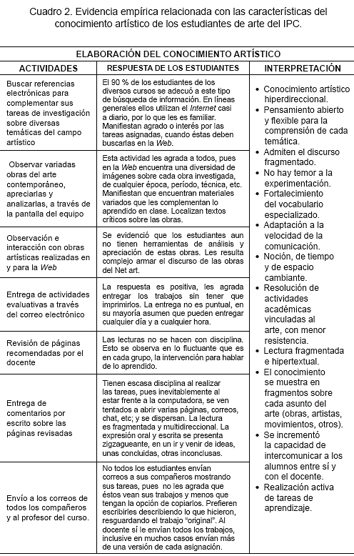 • A partir de la experiencia con los estudiantes, es posible decir, que la estructura del conocimiento artístico, es hiperdireccional, donde los saberes recaen en modos de pensamiento abierto y flexible, lo que admite un discurso fragmentado, reflejado en sus propios discursos sobre temas del arte y en su praxis artística, poniéndose en evidencia que no hay temor a la experimentación.