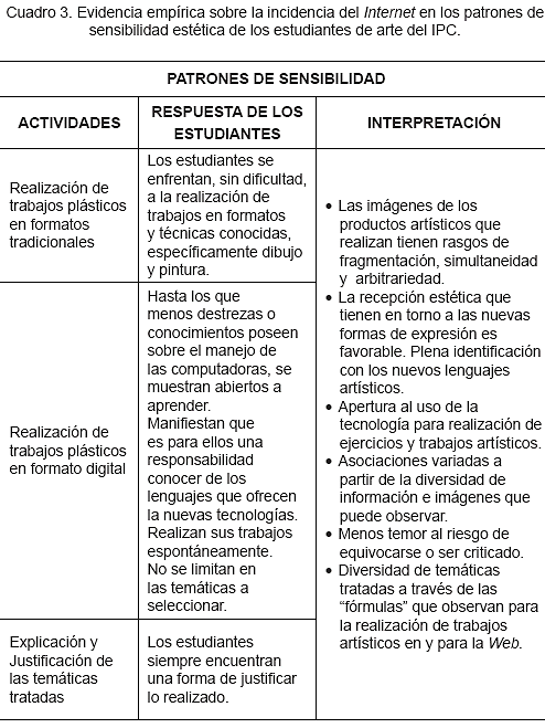 En cuanto a la elaboración de nuevos patrones de sensibilidad estética vinculados con la apreciación de obras de las artes plásticas, los estudiantes han ido conformando nuevos patrones de sensibilidad, los que se aprecian en los productos artísticos que realizan, y en la recepción estética que tienen en torno a las nuevas formas de expresión que posibilita la red de Internet.