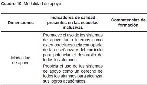 En relación a la dimensión modalidad de apoyo (ver Cuadro 10), no se identifica ninguna competencia de la formación del Docente Especialista en DA con el deber ser de una escuela inclusiva en el marco de la diversidad, ya que la formación de ese profesional de la docencia sólo responde a la línea de acción cooperativa en pequeños grupos sin dar respuesta a las otras dos líneas de acción tales como atención dentro del ámbito del aula regular y en el ámbito comunitario.