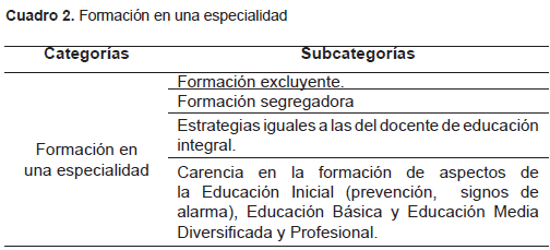 La segunda categoría fue descrita como Formación en una Especialidad , con características de hiperespecialidad según los informantes, (ver cuadro 2), en ella se visualiza de forma no proactiva en función de la visión del estudio realizado, pues las subcategorías se orientan a evaluar el actual diseño bajo una concepción que tiende a la Formación Excluyente y Formación Segregadora.