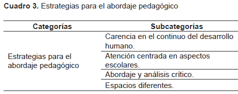 La tercera categoría fue señalada como Estrategias del abordaje pedagógico, donde los participantes señalaron que la formación del docente especialista en DA, no reporta en el marco de la acción educativa especializada, referenciales metodológicos que bien pudieran estar orientados a la igualdad de condiciones sin dejar de percibir la diferencia en el educando, por lo que en términos de subcategorías se identifican como Carencias en dominios conceptuales y procedimentales sobre la Educación Inicial, Básica y Media Diversificada, además de centrar la atención en aspectos referidos a lectura, escritura y matemática, generando en consecuencia una atención educativa a nivel individual sesgada en cuanto a la visión integral y holística del educando y de igual manera una desatención de los procesos sociales de inclusividad de unos con los otros, en términos de la diversidad, tal como se aprecia en el cuadro 3.