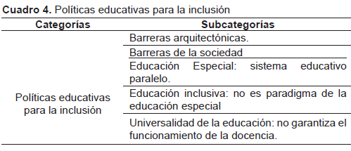 La cuarta categoría fue denominada Políticas Educativas para la Inclusión donde el grupo de informantes, permitió identificar un conjunto de subcategorías en términos de ausencia y/o carencia en el proceso de formación del estudiante en DA (ver cuadro 4), lo cual pudiera perjudicar por omisión, la práctica de un conjunto igualmente de derechos, los cuales estarían orientados al desarrollo de un mayor y mejor bienestar individual y colectivo de las personas en situación de discapacidad.