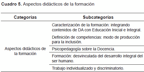 La quinta categoría fue denominada Aspectos didácticos de la formación (ver cuadro 5), en la que se hizo énfasis en la visión desarticulada que posee dicha formación y sin posibilidades de que el estudiante tenga elementos, en términos de competencias, para comprender y desarrollar procesos enmarcados en una escuela inclusiva, por el contrario se observa una formación centrada en un trabajo pedagógico caracterizado por una atomización de tareas desvinculadas de una educación orientada a la atención de la diversidad y de la inclusión, categorías éstas que requieren de conceptos, procedimientos y valores consustanciados con lo integral, holístico y universal del ser humano, en relación consigo mismo y con los otros.