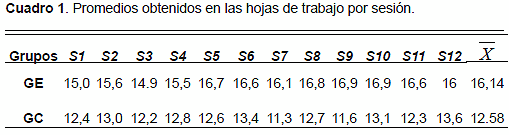 Se observó en estas hojas de evaluación que el GE obtuvo mayor puntaje que el GC, tanto por sesión de trabajo como en promedio general.