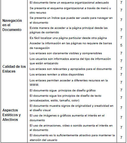 Prototipo Inicial del Ambiente Web. En relación al prototipo inicial de la pagina Web, evaluada por tres personas, se recomendó quitar una serie de imágenes en movimientos que fueron consideradas distractores, al igual que la corrección de enlaces y del peso excesivo de la página, lo que limitaba la acción en la red. Estos resultados condujeron al rediseño del prototipo y su posteriormente evaluación. Los resultados de los siete evaluadores se muestran en el cuadro 3. A quienes se les aplicó el instrumento elaborado por Poleo (2005).