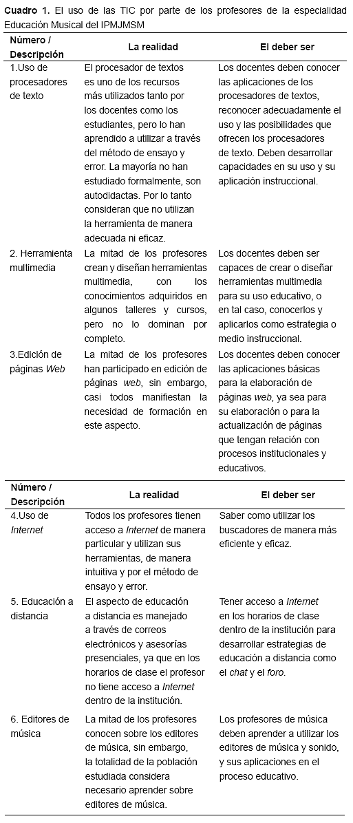 Luego de analizar los resultados obtenidos del cuestionario aplicado a los profesores de la especialidad Educación Musical del IPMJSM, se determinó que es necesario que dichos profesores desarrollen capacidades y habilidades en el manejo de las TIC y su aplicación didáctica. La mitad de los profesores han procurado su propia formación en esta área y la otra mitad no ha realizado estudios vinculados con las TIC, por ello se considera conveniente que los profesores realicen estudios formales al respecto, obteniendo formación por expertos, y se recomienda realizar un seguimiento del proceso y los resultados.