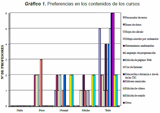 En relación a los contenidos de los cursos, los profesores están más interesados en: procesador de texto, herramientas multimedia, edición de páginas web, educación a distancia (a través de las TIC), editores musicales y el uso de Internet. En menor importancia reconocieron otros contenidos como: edición de sonido, edición de video, dibujo asistido por ordenador, hojas de cálculo y base de datos. Cabe destacar, que todos los profesores de educación musical del IPMJMSM manifestaron necesitar información relacionada con educación a distancia a través de las TIC y editores de música. En el siguiente gráfico se pueden observar las necesidades identificadas.