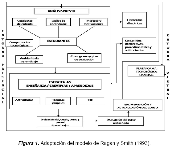 Es importante destacar el papel de los diferentes modelos de diseño instruccional, como marco metodológico conceptual, ya que ofrecen los supuestos y las técnicas a utilizar en el abordaje de distintos problemas de enseñanza. En cuanto al modelo de diseño instruccional considerado en este trabajo para llevar a cabo el rediseño del curso Estrategias y Recursos Instruccionales bajo la modalidad Semipresencial se asumió el modelo de diseño instruccional de Ragan y Smith (1993) que fue adaptado a las necesidades y al contexto del IPC y a las exigencias del entorno donde se encuentra inmersa la institución. La siguiente figura presenta la adaptación de la autora a dicho modelo.