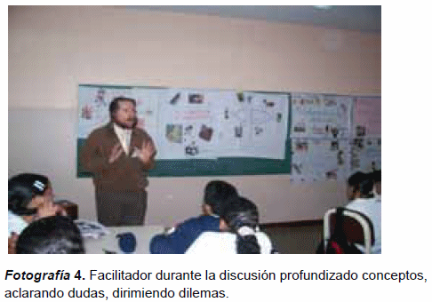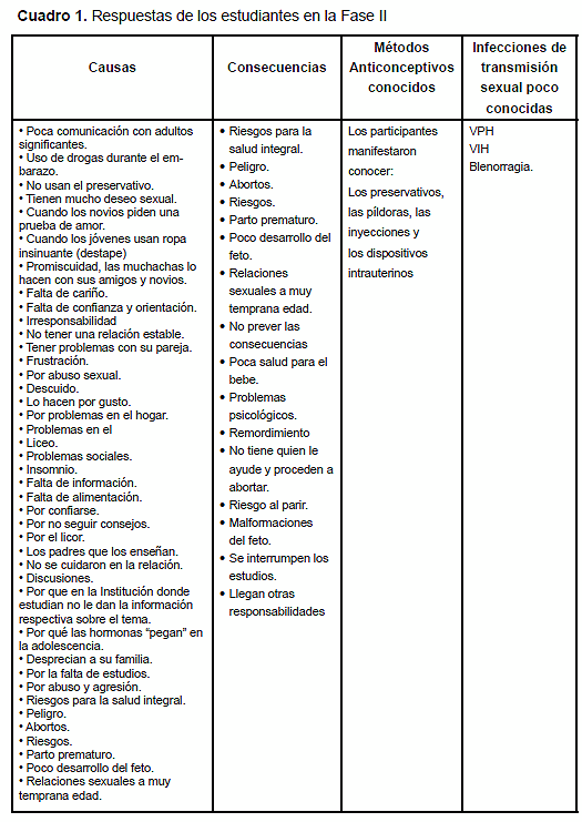 Fase III. Presentación y análisis del video, titulado: Huellas donde se muestran a varios adolescentes de algunas escuelas básicas y del Ciclo Diversificado del Distrito Capital, dando testimonio de lo que para ellos significa el embarazo en los adolescentes. Finalizada la proyección el investigador, mediante preguntas socráticas, preguntó a los estudiantes por sus significados e interpretaciones de lo planteado en el video. Al final aclaró dudas y profundizó en contenidos que se manejaban de forma incorrecta, como por ejemplo, algunas definiciones erróneas acerca de las infecciones de transmisión sexual y ciclo menstrual, el cual era desconocido por la mayoría de los estudiantes.