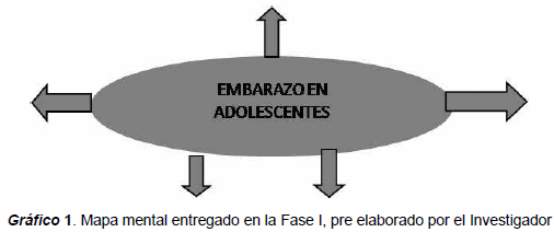Fase I. Inicio del trabajo con los estudiantes: El Docente encargado de aplicar la Mediación Didáctica, señala las pautas a seguir y explica la actividad. Entrega el material para completar, el mapa mental (ver gráfico 1). Como parte de esta fase se formulan preguntas socráticas a los participantes en relación con el embarazo en los adolescentes (EA), con la finalidad de que a partir de las respuestas de los estudiantes se pudieran evidenciar los conocimientos previos que tenían para su posterior discusión. Inicialmente el investigador actuó como espectador y permitió la confrontación de ideas y promocionó la riqueza dialógica entre los estudiantes, para posteriormente mediar en los conceptos que no fueron manejados con propiedad, como por ejemplo confusión entre portador sano y estar enfermo de SIDA. Se evidenciaron algunos dilemas como el referido al número ideal de hijos que puede tener una pareja, en la interacción se analizaron los pro y los contra y se arribo a la respuesta más asertiva.