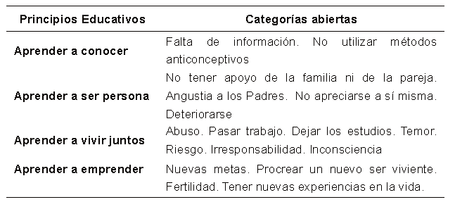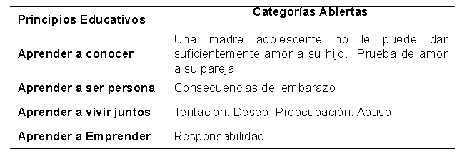Cuadro 2. Resumen con las categorías abiertas encontradas, combinadas con los principios educativos