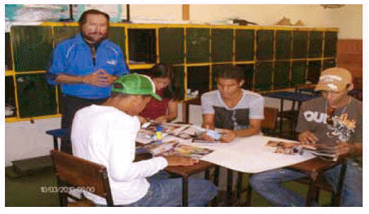 Los alumnos con revistas y periódicos elaboraron un mapa mental por equipo, seleccionando figuras que tuvieran relación con el fenómeno en estudio y su construcción en hojas de papel bond, esta actividad tuvo una duración de aproximadamente 20 minutos. Posteriormente se presentó y defendió, para ello nombraron un relator quién representó al equipo durante la realización de la actividad. Los estudiantes colocaron el producto de su trabajo en el pizarrón o rota folio, se promovió la discusión y el facilitador aclaró las dudas y posibles dilemas que se presentaron. Finalmente, se entregó el mapa elaborado por equipo para elaborar el mapa mental de todos los participantes. Las fotos 3 y 4 muestran la construcción en equipo del mapa mental.
