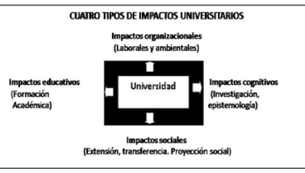 Esta referencia permite, en el marco del reconocimiento de la responsabilidad social, el monitoreo sistemático del modo de producción y gestión que aplica una determinada universidad. Entre tanto, la tarea de conjugar actividades de “impacto” dirigidas a cubrir demandas sociales dentro y fuera del campus (grupos de interés/ stakeholders), va más allá de la responsabilidad que tradicionalmente ha atendido la extensión universitaria, se trata de permear en todas las funciones de la organización a partir de los cuatro procesos que describe Vallaeys y otros (2009), “gestión, formación, producción de conocimientos y participación social.” (p. 10).