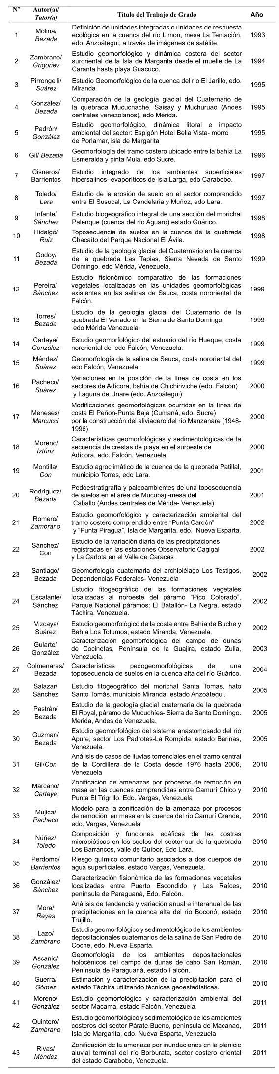 Cuadro 1. Egresados de la Maestría en Geografía, mención Geografía Física (IPC: 1993- 2011)