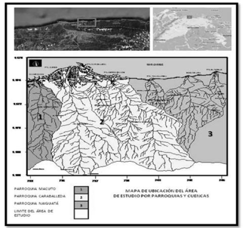 El área está objeto de este estudio, se ubica en el estado Vargas, Venezuela, específicamente, en el sector centro norte costero, desde Camurí Chico hasta Punta Tigrillo entre los 10°30’ y 10°35’ N y 66°52’30” y 66°45’ W, conformada por siete (7) cuencas que son: Camurí Chico, San Julián, Quebrada Seca, Río Cerro Grande, Tanaguarena, Carmen de Uría y El Tigrillo, alcanzando una superficie de 77,79 Km2 y un tramo de costa de 24,43 Km de longitud, en jurisdicción del Municipio La Guaira; parroquias Macuto, Caraballeda y Naiguatá del estado Vargas, que incluyendo 35,4 Km2 de las áreas circundantes a las cuencas, que comprende el cuadrante de estudio, corresponden a un área total de 113,14Km2 (figura1). En cuanto a los relieves, estos alcanzan alturas máximas entre los 1000 msnm y los 2480 msnm en la Cuenca del Río Cerro Grande.