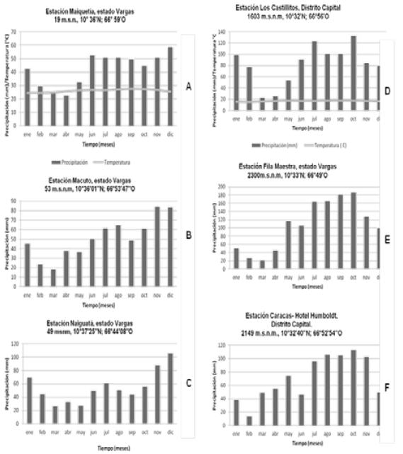 Considerando la altitud de las estaciones sinópticas y pluviográficas representativas para el área de estudio, se ubican en el piso térmico Tropical (TR) en la cuenca baja: Maiquetía 26°C a 43 msnm; Macuto 53 msnm; y Naiguatá 49 msnm; mientras que, para la cuenca alta, se ubican en el piso térmico Templado (TE) la estación Los Castillitos con 16,8°C y 1603 msnm, y en el piso Frío (FR) en las estaciones Caracas- Hotel Humboldt (2149 msnm) y Fila Maestra (2300 msnm). En cuanto a las precipitaciones, estas son escasas en el área de estudio, con mayor aridez en la parte baja de las cuencas. Presentan valores anuales superiores a 514mm (estación Maiquetía) superando los 1000 mm en la cuenca alta en la Fila Maestra. En mayor detalle, al analizar la distribución pluviométrica anual por cada estación, en las estaciones de la parte baja de las cuencas, la estación Maiquetía, es la más árida de todas, registrando montos máximos de 53 mm en junio (temporada que se extiende hasta septiembre, sobre 51 mm) y otro punto máximo en diciembre alcanzando su mayor monto anual, 59 mm; mientras que los montos mínimos se presentan en marzo con 25 mm y abril con 23 mm, siendo este el más seco.