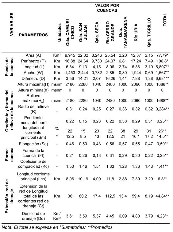 En resumen, las estaciones analizadas se caracterizan por temperaturas altas durante todo el año, precipitaciones en promedio escasamente superiores a los 500 mm, una evaporación que la excede casi al doble de esta proporción y aumentos de los montos por la acción de la Zona de Convergencia Intertropical en los meses centrales (en promedio de mayo a septiembre, para la parte baja de las cuencas y se extiende hasta octubre en la parte alta) y otro pico máximo en diciembre- enero (en la parte baja) producto de la influencia de las actividades extratropicales y la influencia sobre el borde costero; comprendiendo de acuerdo a la clasificación climática de Köppen, climas tropicales esteparios (BShi) para las cuencas bajas y clima tropical seco (Awi) e incluso, Templados de Altura (CHwi) en las cuencas altas. En otro orden de ideas, la caracterización morfométrica de las cuencas que conforman el área de estudio: Camurí Chico, San Julián, Quebrada Seca, Cerro Grande, Tanaguarena, Uría y El Tigrillo; se realizó en función de las variables siguientes: (a) escala de la cuenca, (b) gradiente y forma del relieve de la cuenca, (c) forma de la cuenca, y (d) extensión de la red de drenaje. Los datos del cuadro 1 reflejan que las áreas de drenajes estudiadas corresponden a sistemas hidrogeomorfológicos de pequeñas proporciones, favoreciendo la ocurrencia de crecidas y lapsos cortos de tiempo de concentraciones en posibles tormentas de intensidad significativa, duración y extensión, como se observó en 1999 y en menor proporción en 2005.