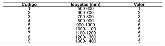 Al ubicar el óptimo pluviométrico en la cota de los 1500 msnm, se procedió a ponderar las bandas de precipitación del mapa de isoyetas considerando los mayores hacía el optimo disminuyendo a la línea de costa (Figura 5). Este valor dado en grados de intensidad, se sumó a los porcentajes obtenidos en los mapas de susceptibilidad, utilizando la siguiente fórmula: