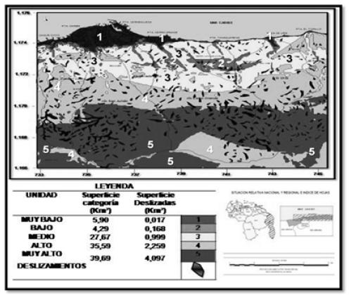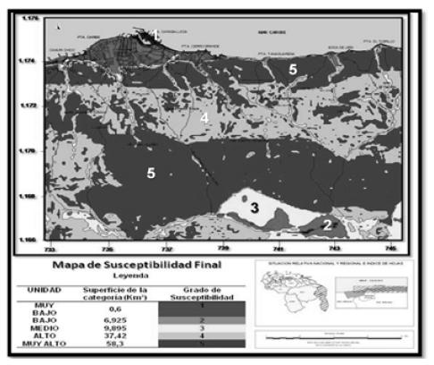 Al analizar la figura 3, se puede apreciar que predominan las áreas de muy alta y alta susceptibilidad con 95,72Km2, es decir un 84,6%, seguido por las medias con 8,74% y de bajas a muy bajas con 6,72%, coincidentes con los afloramientos de las diversas formaciones geológicas que le dan sustento, principalmente Esquistos de Tacagua, Peña de Mora y la Asociación Metamórfica del Ávila, que presentan la más elevada categoría de susceptibilidad. Al unir esta variable con altas pendientes, la supremacía de las laderas rocosas y poco disectadas, conforman las zonas de altas susceptibilidades a ser removidas en el conjunto del área de estudio.