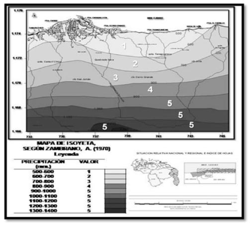 La ubicación altitudinal de este parámetro dependerá de las características del sistema montañoso. Variará considerando la humedad absoluta del nivel de base del valle y de las circulaciones locales. Por encima del óptimo pluviográfico, la disminución de la humedad del aire con la altura a escala global y de la cantidad de agua precipitable en las nubes convectivas a escala local son los dos factores que explican la disminución de la precipitación con la altura a las montañas más altas. Por ello, se propuso reconocer las lluvias medias anuales promedios a partir del mapa de isoyetas de Zambrano (1970) y los datos de precipitación Dirección de Hidrología y Meteorología del MARN/ Sistema Nacional de Información Hidrológica y Meteorológica (SINAIHME, 2008), ya que los datos se presentan en promedio superior a los diez (10) años en 60% de ciento treinta y siete (137) estaciones pluviométricas empleadas como muestras, de las cuales veintiséis (26) pertenecen al litoral central venezolano, encontrándose dentro de la data específicamente localidades cercanas o pertenecientes al área de estudio como Maiquetía, Macuto, Camurí Chico, San Julián y Uría, por citar algunos ejemplos. La escasa información y poca sistematización para obtener los datos climáticos, así como la comprobación por contraste de datas de la vigencia y congruencia de este mapa de isoyetas con los valores de precipitación anual obtenida en los datos del SINAIHME, permitieron validar y emplear esta fuente como desencadenante a amenazas por movimientos en masa.