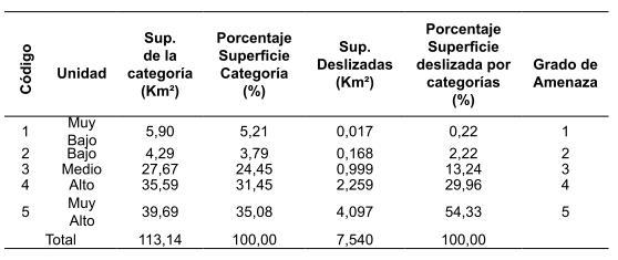Como se puede apreciar en el mapa de amenazas a los movimientos de remoción en masa por las precipitaciones (figura 5), la posibilidad generarse nuevamente deslizamientos por las lluvias anuales son altas ya que predominan las unidades de Muy Alta amenaza, con 39,69 Km2 de superficie, lo que equivale al 35,08% del área de estudio; seguido por la unidad de Alta amenaza que se extiende en 35,59 Km2, representando proporcionalmente, el 31,45% de la misma área.