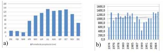 Gráfico 1. a) Precipitación promedio mensuales de la estación Santa Rita durante el período 1974 – 2005; b) Promedio de precipitaciones anuales en Santa Rita.