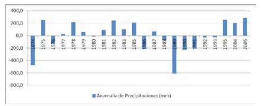 El gráfico 2 presenta las anomalias encontradas en los montos de precipitaciones registrados para la serie de 1974 a 2005, en el se puede precisar los años en los cuales los datos pluviométricos se elejaron considerablemente del valor promedio calculado para dicha serie. Tal es el caso de los años 1974 y 1989, donde los registros reflejan disminusión de los valores de precipitación que rondan el 50% para el primero de los años considerados, y casi un 60% para el año 1989, donde cabe destacar el período de sequía se prolongó al menos por dos años más.