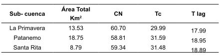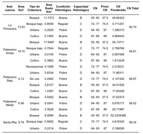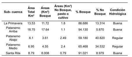 En el caso particular de la sub- cuenca, Aguas Arriba, que corresponde a la naciente del río Patanemo hasta la sección hidráulica donde confluye con el río La Primavera, contrasta lo que comúnmente se asocia directamente por definición, “el caudal pico es proporcional al área de la cuenca” (Rivera, 2002), cuando en la evaluación de los datos presentados, no es así. Dicha diferencia se debe a que 94% de la sub-cuenca Aguas Arriba está cubierta por bosque, lo que la ubica en una condición hidrológica de Buena, lo que se traduce en una tasa elevada de infiltración, disminuyendo los niveles de escorrentía superficial que se convierte en menor caudal aportado.