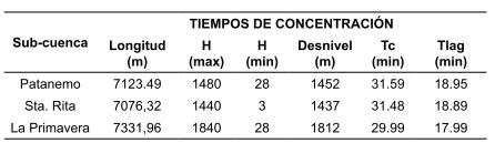 Donde: L; se refiere a la longitud del cauce principal expresado en metros; y H se refiere a la diferencia altitudinal entre el punto más alto y el más bajo del segmento del río. En el cuadro 6, se presentan los valores de Tc calculados para cada cauce principal del río Patanemo.