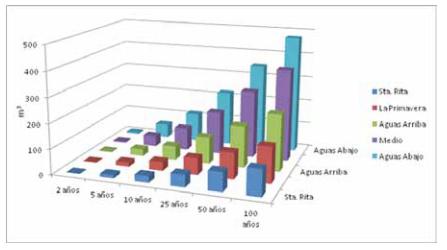 En el cuadro 8 y el gráfico 3, se muestran los caudales pico estimados con HEC-HMS, para cada sub-cuenca del área de estudio, con base en los parámetros calculados anteriormente para CN y tiempos de concentración, en el gráfico 3, se evidencia que el comportamiento de los montos de caudal estimados por el programa HEC-HMS, son progresivos a medida que aumenta los períodos de retorno del evento extremo, sin embargo, cuando se comparan los valores de caudales con las áreas definidas para cada una de las cuencas, en el gráfico 4, se pueden apreciar ciertos factores que están condicionando dicho comportamiento.