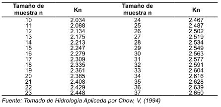 Chow et. al. (1994), plantean que los valores de kn se utilizan para detectar datos dudosos en nivel de significancia de 10% de información normalmente distribuidos, si los logaritmos de los valores de una muestra son mayores que Yh , son considerados como datos dudosos altos, siendo en consecuencia, eliminados de la serie. Asimismo, si dichos valores se hayan por debajo de Yl son considerados datos dudosos bajos y de igual forma son eliminados, para posteriormente iterar el cálculo de umbrales hasta que no exista dato alguno que se encuentre fuera de los rangos calculados. Se debe tener en cuenta que los valores de Kn (cuadro 3) deben ser reconsiderados ya que los n valores de la serie pueden verse disminuidos.