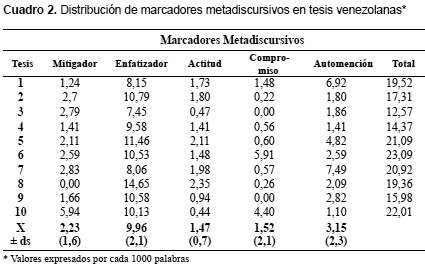 Los cuadros 2 y 3 presentan los datos correspondientes a las tesis. El valor promedio (x ± ds) de marcadores totales de las venezolanas es de 18,90 ± 3,45 por cada 1000 palabras. Este resultado es prácticamente igual en las tesis españolas (19,60 ± 7,38).