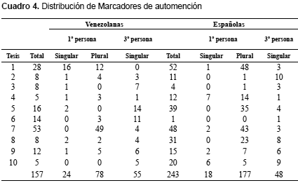 El aporte porcentual de cada subtipo al total de marcadores de auto mención, para las tesis venezolanas es: Primera persona del singular (15%) Primera persona del plural (50%) y Tercera persona del singular (35%). En las tesis españolas los valores correspondientes son: 7%, 73% y 20% respectivamente.