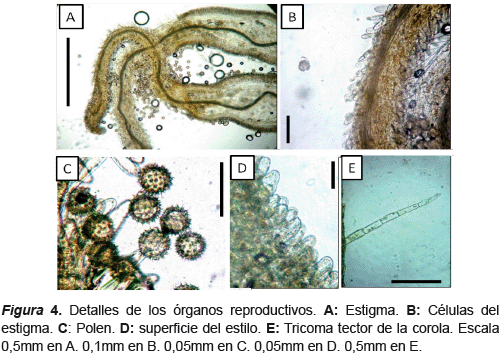 Corimbos axilares y terminales con 4-5 capítulos (figura 1). Los capítulos contienen cinco flores (figura 2). Involucro con cinco filarios tomentosos de pelos tectores y gladulares (figuras 2C y 3A), papiráceos y cuadrangulares (base ancha y ápice agudo), de longitud variada (tres filarios cortos y dos largos) 5-7mm (figura 3D). Flores blancas hermafroditas, tubulares con cinco lóbulos, pubescente en ambas caras, con tricomas glandulares y tectores pluricelulares en la superficie externa (figura 4E); cinco estambres con anteras de dehiscencia longitudinal (figura 3B). Estilo ensanchado en la base, dividido en dos estigmas de superficie densamente papilosa (figuras 4A, B, D). Polen esférico y equinado (figura 4C).