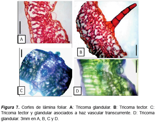 Anatomía de la lámina foliar: epidermis uniestratificada en ambas caras, en sección transversal epidermis adaxial con células rectangulares a ligeramente globosas y de mayor tamaño con respecto a las células de la cara abaxial (figuras 5 y 7). En vista paradérmica, células delgadas, ligeramente alargadas y de contornos sinuosos y tricomas tectores pluricelulares (10 células) con varias células basales (3-4) y estomas anomocíticos muy dispersos (figuras 6C y D). Epidermis abaxial con células subglobosas a cuadrangulares en vista transversal (figuras 5 y 7). En vista paradérmica, células similares a la epidermis adaxial, con mayor número de estomas, tricomas glandulares hundidos en el tejido y tricomas tectores (figuras 6A y B). En ambas caras cutícula delgada con paredes periclinales y anticlinales delgadas. Se observan tricomas tectores en ambas caras de la lámina y tricomas glandulares en la cara abaxial.