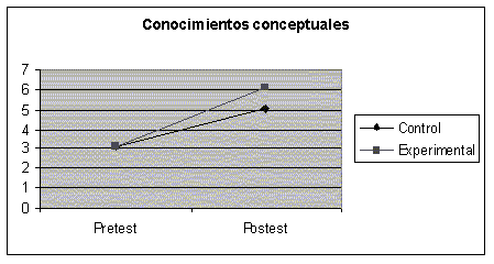 En cuanto a sus conocimientos conceptuales sobre medio ambiente y la problemática ambiental, en el pretest se pone claramente de manifiesto que, en su mayor parte, los sujetos desconocen los conceptos básicos relativos al medio ambiente y manifiestan ideas confusas (sobre todo en lo relativo a las relaciones causa-efecto) acerca de los principales problemas que le afectan; aunque existe una pequeña diferencia entre las puntuaciones medias obtenidas por cada grupo, que es mayor en el grupo de control.