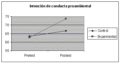 En lo que respecta a la intención de realizar conductas sostenibles, de los datos obtenidos en el pretest se comprueba que la preocupación ambiental percibida, similar en ambos grupos, no se corresponde con la intención de conducta a favor del medio, que es muy inferior; pudiéndose señalar respecto a esta última que existe una mayor disposición a realizar comportamientos de carácter individual y en escenarios cotidianos, antes que otros comportamientos que implican una acción grupal.