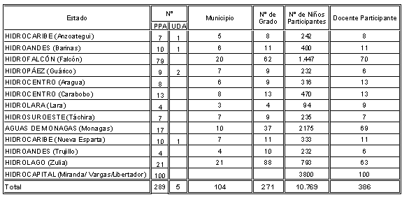 En Venezuela se ha considerando el uso del recurso agua como un problema prioritario dentro de los planes de desarrollo de la nación y se estableció dentro de las políticas de Educación Ambiental y la educación de la ciudadanía la importancia del uso sustentable de este recurso Febres, Luque, Aranguren y Velasco (1997). Atendiendo a esta necesidad desde el año 2000, se desarrolla el Programa Educativo Ambiental El Agua en Nuestras Vidas como una iniciativa del Ministerio del Ambiente y de los Recursos Naturales (MARN), la Hidrológica Venezolana HIDROVEN, las Empresas Hidrológicas Regionales y el Ministerio de Educación Cultura y Deportes (MECD) incorporando a los docentes y estudiantes en las actividades de formación (Hidroven, 2001a, 2001b, 2002).