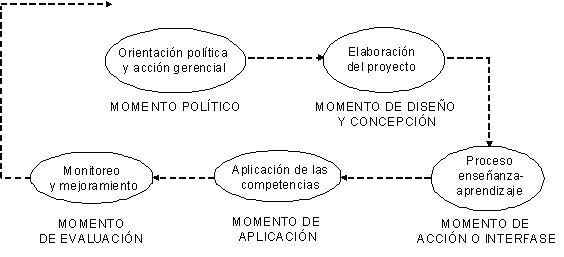 Desde esta perspectiva, el éxito de las acciones educativas depende de la garantía de calidad que se logre en los cinco momentos del proceso de formación: político, de diseño, acción, aplicación y evaluación, (Figura 1). Se observa por lo tanto que el diseño educativo se ubica en el segundo momento del modelo propuesto por Betancur (ob. cit); sin embargo con la finalidad de suministrar una visión holística de la propuesta, se describe la totalidad de los componentes del sistema con miras a contextualizar la puesta en funcionamiento del diseño educativo.