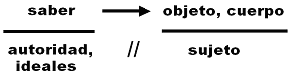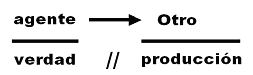 En el discurso pedagógico (entendido aquí como discurso universitario, siguiendo siempre a Lacan; 1981, 1992) el agente ocupa un lugar de saber, el cual se sostiene en una posición implícita de poder (o al menos de autoridad, en tanto representante de los ideales o imperativos culturales). Desde este lugar de saber, el agente se dirige al recién llegado en tanto material humano tomándolo como objeto de la acción educativa, v.g., como cuerpo viviente a ser trabajado, humanizado y domesticado por el saber, pero también como cuerpo en el que encarna la promesa de lo nuevo es decir, como natalidad, en el sentido de H. Arendt (1996). Lo que se espera de ese trabajo educativo es finalmente la producción de un cierto sujeto. En términos del matema del discurso universitario,