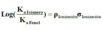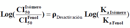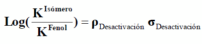 En esta ecuación, los términos KIsómero y KFenol son las constantes de velocidad de las reacciones del radical libre con el fenol y sus isómeros geométricos. Aplicando el modelo de Hammett, el término σDesactivación puede obtenerse a partir de las constantes de ionización de los compuestos fenólicos. Por lo tanto, asumiendo que ρIonización es igual a la unidad se tiene que: