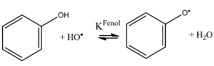 Donde Ka Fenol corresponde a la constante de ionización ácida del fenol. El término Ka Isómero representa la primera constante de disociación ácida de los isómeros meta y para del hidroxifenol. Para la reacción que involucra la desactivación de los radicales libres, la ecuación química toma la forma: