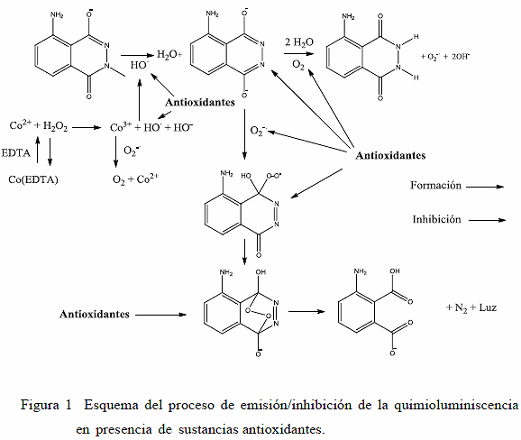 De acuerdo con el esquema de la figura 1, existen diferentes rutas de acción por medio de las cuales los antioxidantes pueden inhibir la emisión QL del luminol. Una de las más importantes se asocia a la desactivación de los radicales hidroxilos. Los compuestos antioxidantes también pueden actuar sobre otras especies reactivas de oxígeno, evitando la formación del endoperóxido, que es un producto intermedio necesario para obtener al aminoftalato excitado (Giokas y col. 2007).