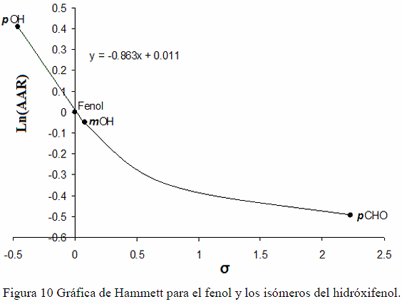 Tomando como ejemplo los isómeros del hidroxifenol, se aplicó la ecuación de Hammett a fin de establecer una relación cuantitativa entre la capacidad antioxidante medida por el método QL y la presencia de los grupos hidroxílicos en posiciones meta y para. En esta ecuación se asumió que en una molécula aromática como el fenol, los efectos de los sustituyentes sobre las constantes de ionización pueden ser empleados para predecir la influencia de esos mismos sustituyentes en una variedad de reacciones, entre las cuales están las reacciones que involucran a los radiales libres (Miller, 2004).