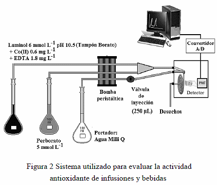 En este trabajo se propone la aplicación método basado en la desactivación de las especies reactivas de oxígeno que se forman durante la descomposición del perborato de sodio catalizada por el ión Co(II). Estos radicales libres promueven la oxidación del luminol, lo cual se manifiesta por la emisión de radiación en la región visible del espectro. Sin embargo, en presencia de moléculas que exhiban la capacidad de desactivar a estos radicales libres, la emisión quimioluminiscente (QL) disminuye en una forma proporcional a la actividad antirradical de dichas moléculas (Atanassova y col. 2005, Parejo y col. 2000). Por lo tanto, el método propuesto se basa en un sistema de inyección en flujo continuo en el que los extractos que contienen a los antioxidantes se hacen reaccionar con la mezcla luminol-perborato-Co(II) y, dependiendo de la magnitud de la inhibición de la emisión quimioluminiscente, se mide la actividad antirradical.