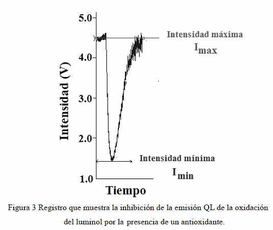 Por medio del sistema de detección se obtienen registros de intensidad en función del tiempo. Por ejemplo, un registro típico es mostrado en la figura 3, donde puede observarse la emisión QL inicial, que determina el valor de Imax, seguida de la disminución producida por el efecto antirradical de los componentes de la muestra inyectada, tomando la forma de un pico negativo, donde el valor mínimo corresponde a Imin.