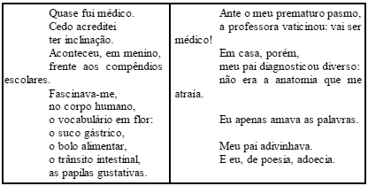 Eu não sou de confiança. E não mereço confiança porque me falta a crença, essa espécie de fé que deve ser o chão de um cientista. Sou um biólogo, mas não moro na biologia. Estou na biologia como um visitante, com a alma errando pelos domínios da literatura. (COUTO, 2005a, p. 113).