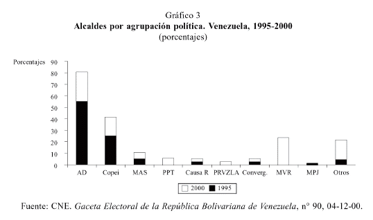 Definitivamente, se podría afirmar que ya no se presenta bipartidismo alguno entre AD/Copei en el nivel regional, pero ello no es así en los niveles locales, donde estos dos partidos aún mantienen una concentración significativa de votos. Para estas elecciones, AD/Copei concentraron el 42 por ciento de los cargos en las alcaldías; sin embargo, la mayoría de los votos se orientaron hacia AD y MVR. Sorpresa fue el Movimiento Primero Justicia (MPJ) que incursiona por primera vez en la contienda electoral, obteniendo tres alcaldías importantes, dos de ellas en el área metropolitana de Caracas y una en el estado Miranda, además de cinco puestos en la Asamblea Nacional.