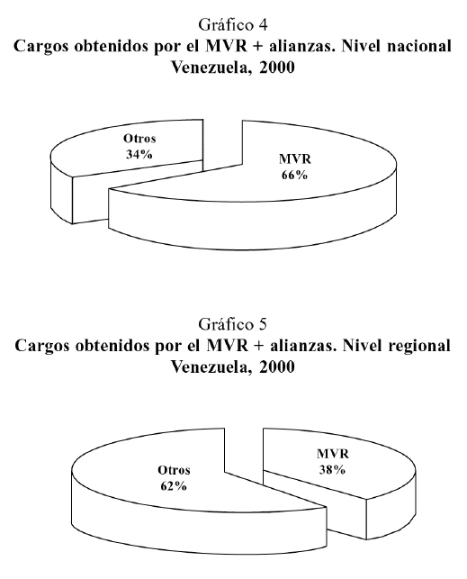 El presidente Chávez en poco tiempo supo tomar para sí el descontento de la población y a través de siete consultas celebradas en tres años (cuatro procesos electorales y tres referendos), logró consolidar su fuerza en el país. En el nivel nacional, el MVR más alianzas concentraron, aproximadamente, el 58 por ciento de los cargos; mientras que en el plano regional concentraron el 38 por ciento; el resto del espacio político se encuentra ocupado, al menos, por seis organizaciones políticas de carácter nacional y un numeroso universo de pequeños grupos y grupos de electores regionales. La distribución del poder entre el MVR más alianzas y el resto de las organizaciones políticas en ambos niveles queda visualizado en los gráficos 4 y 5 (se excluyó los cargos al Parlamento Latinoamericano en donde el MVR obtuvo 8 cargos de un total de 12 y al Parlamento Andino en donde obtuvo 4 de un total de 5; igualmente se excluyó los cargos al Cabildo Metropolitano en donde el MVR obtuvo 7 de un total de 13).