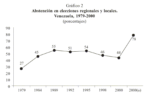 Como podemos observar en el gráfico 2, para la primera fase de las elecciones regionales y locales celebradas en julio de 2000 (gobernadores, alcaldes, concejales, diputados a los consejos legislativos), se produjo un ligero aumento en la asistencia electoral; ello pudiera estar relacionado con que estas elecciones se realizaron conjuntamente con las presidenciales, pero para la segunda fase de los comicios relegitimadores de los poderes municipales la abstención se disparó hasta llegar a los niveles más altos observados hasta ahora (78 por ciento), a pesar de que en el ámbito municipal es donde la participación ciudadana se convierte en el elemento fundamental de gestión, ya que se estrechan las distancias entre el Estado y el ciudadano, entre éste y las decisiones que lo atañen directamente en su vida cotidiana y la de su comunidad.